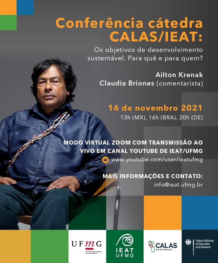Ailton Krenak fará nova conferência sobre os Objetivos do Milênio (ODM) e Objetivos de Desenvolvimento Sustentável (ODS): para quê e para quem? A transmissão conta com os comentários da pesquisadora argentina Claudia Briones e ocorrerá no dia 16 de novembro de 2021, terça-feira, às 16 horas, com transmissão pelo canal do Youtube do IEAT.