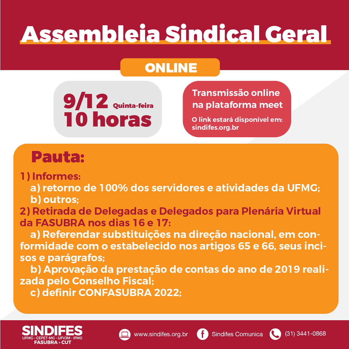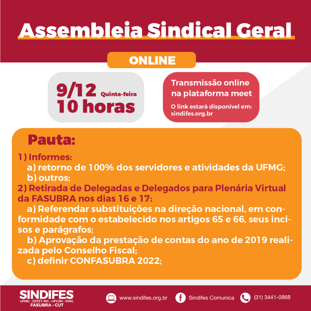 O SINDIFES convoca os Técnico-Administrativos em Educação da UFMG para a Assembleia Sindical Gera (da UFMG) nesta quarta-feira, dia 15 de dezembro, às 10h, via Zoom Meeting (ou outro software que atenda as necessidades da reunião). Na pauta, a retomada das discussões do não retorno às atividades 100% presenciais no dia 10 de janeiro.